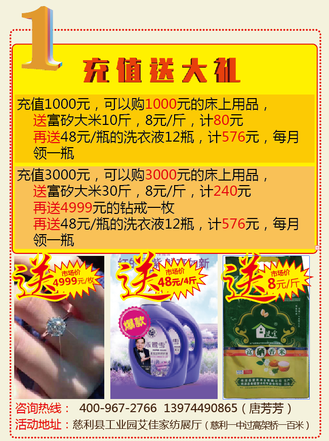 震惊了!快去艾佳家纺展厅领4999元的钻戒、富矽大米、洗衣液,充值即得!假一赔万!购买床上用品,艾佳买单,买多少免多少,只需要充值所买商品的四倍就可以了!